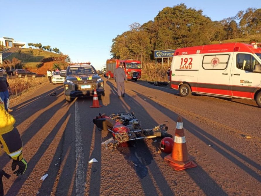 Duas motocicletas colidiram na BR-282, na Linha Canela Gaúcha, município de São Miguel do Oeste, no final da tarde desta quarta-feira (30).