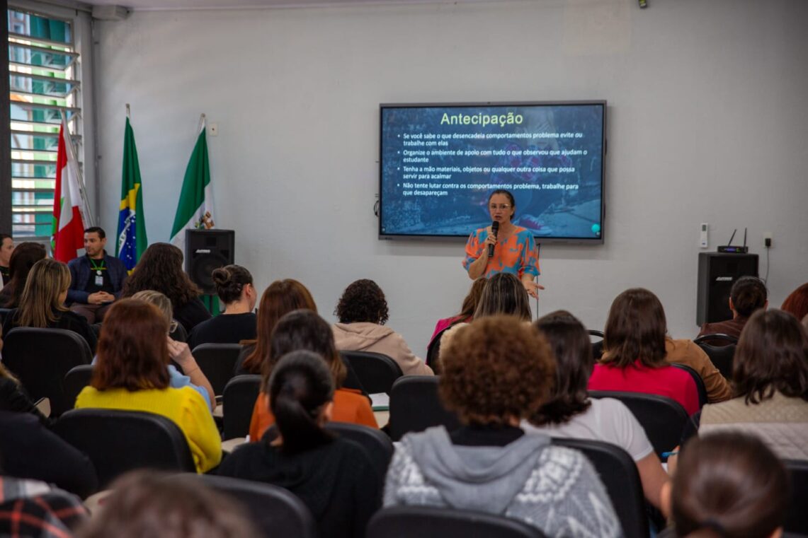 Foi realizada mais uma etapa de formação sobre o Transtorno do Espectro Autista (TEA), no auditório da Secretaria Municipal de Educação de Chapecó (SC), nesta semana. O tema abordado foi “Autismo: Como organizar os ambientes de apoio”, com a formadora Marisa Mello e a equipe da Educação Especial da própria secretaria.