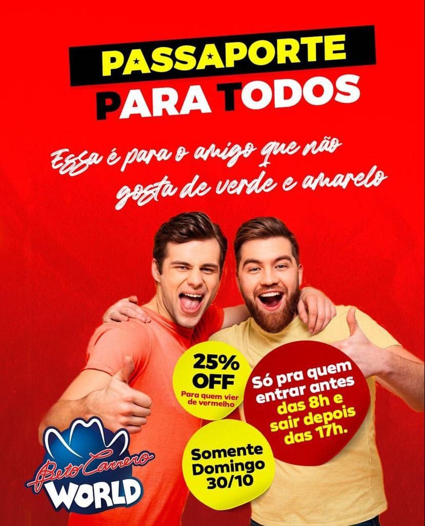 Uma promoção lançada pelo parque Beto Carrero causa polêmica eleitoral. Nas redes sociais, a empresa divulgou uma promoção em que oferta desconto de 25% para pessoas que forem ao parque no dia do segundo turno das eleições, próximo domingo (30) usando roupa vermelha. A promoção seria válida desde que o público entrasse no local antes das 8h e saiam após às 17h.