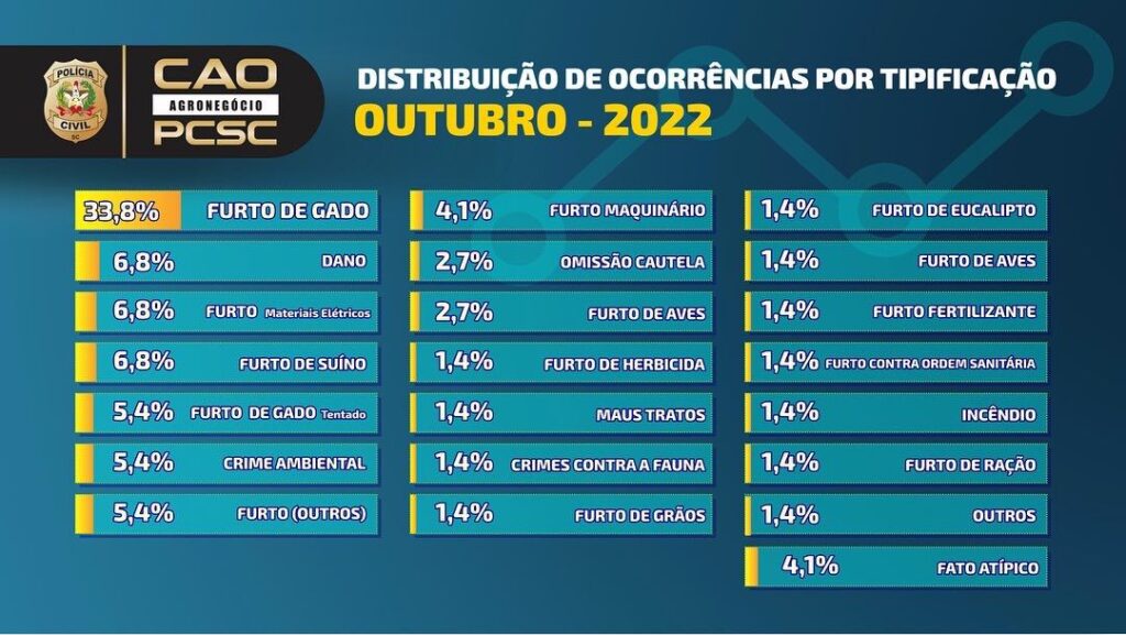 O Centro Estadual de Combate aos Crimes Contra o Agronegócio da Polícia Civil de Santa Catarina (Caoagro/PCSC), apresentou nesta sexta (4) relatório das ocorrências policiais relativas ao mapa de criminalidade contra o agronegócio em SC no mês de outubro.