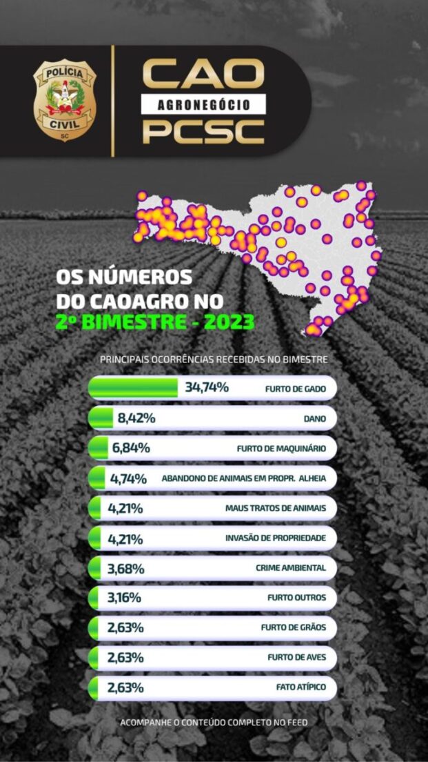 O Centro de Apoio Operacional de Combate aos Crimes Contra o Agronegócio da Polícia Civil (Caoagro), apresentou nesta segunda (8), o mapa da criminalidade contra o agronegócio em Santa Catarina nos meses de Março e Abril de 2023.