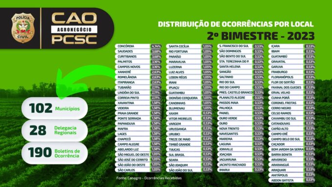 As Delegacias Regionais de Polícia que mais registraram ocorrências contra o agronegócio foram Concórdia com 11%, São Miguel do Oeste com 10% e Maravilha com 9,4%.