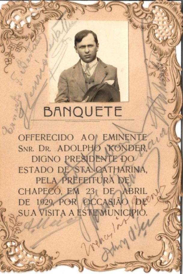 No ponto central da exposição estão dois itens de grande valor histórico: o álbum de fotografias original da viagem, registro visual único da marcha, e um menu do jantar oferecido ao governador em Chapecó, que traz as assinaturas das pessoas presentes naquele encontro memorável.