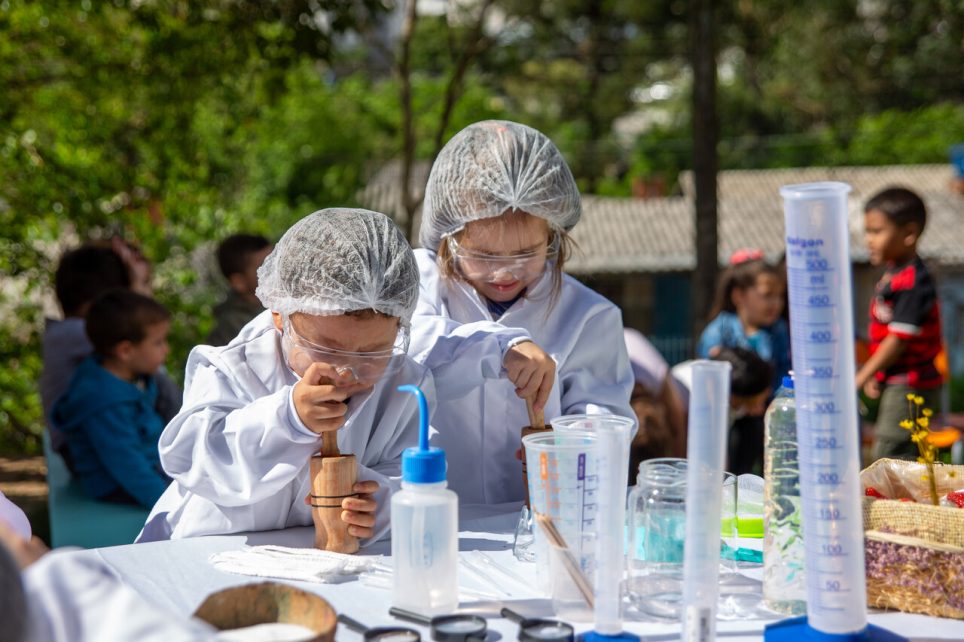 Transformando-se em verdadeiros cientistas, as crianças realizaram uma experiência com a fruta. “Ao misturar morango esmagado com álcool e sal, o DNA se torna visível, formando uma nuvem branca dentro do copo. Agora, a turma sabe que o DNA está presente em todos os seres vivos, inclusive neles mesmos”, explica Sandra.
