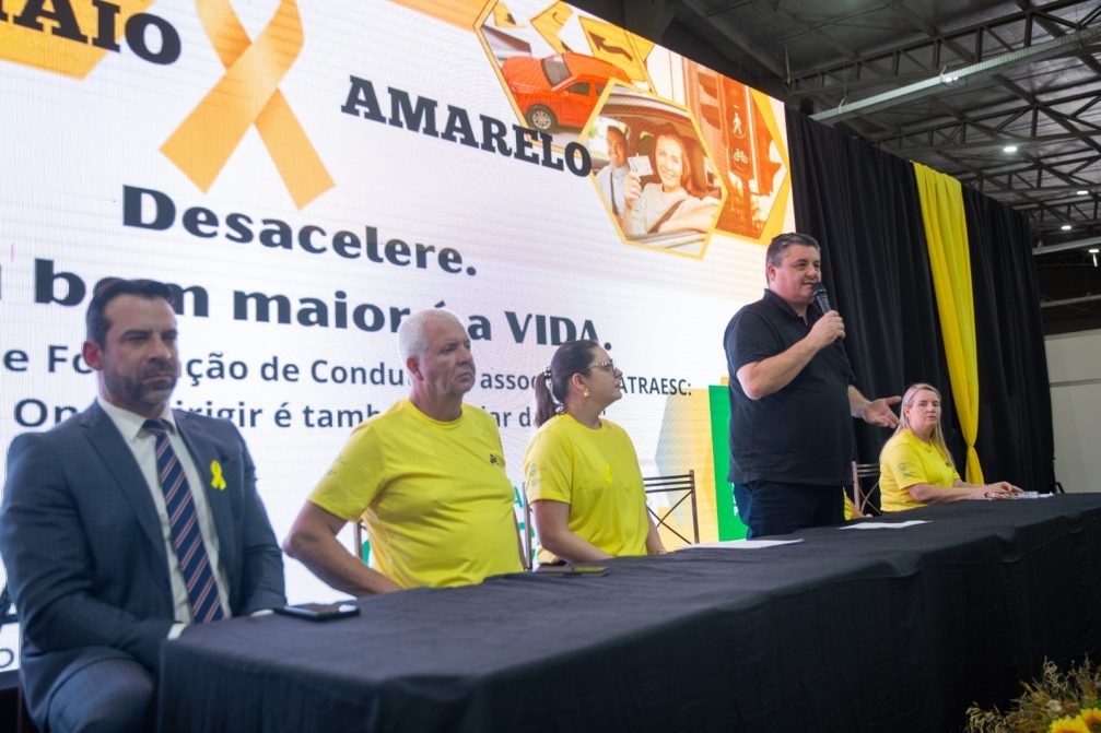 A 1ª edição do Atraesc em Movimento, promovido pela Atraesc (Associação de Trânsito do Estado de Santa Catarina), em parceria com a Prefeitura de Chapecó, foi aberta nesta segunda-feira (5), no Parque de Exposições da Efapi. O ato de abertura do Maio Amarelo, contou com a presença de autoridades municipais, representantes institucionais, profissionais do setor de todo o estado e um grande público, formado principalmente por estudantes.