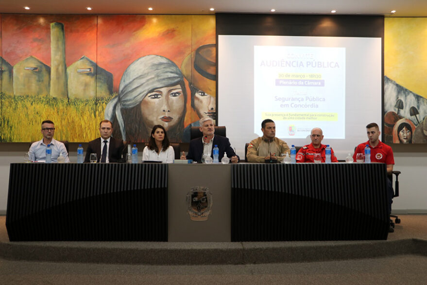 Uma Audiência Pública sobre a segurança no município, reuniu a população e autoridades do poder Legislativo, Executivo, Judiciário e das forças de segurança de Concórdia, nesta quinta (30), no plenário da Câmara de Vereadores. O secretário de Gestão Urbana, Wagner Bee, representando o prefeito, Rogério Pacheco, participou da audiência e destacou os investimentos da Administração Municipal na segurança pública. O foco do encontro foram as ocorrências de brigas e perturbações que estão sendo frequentes nos espaços públicos, como a Praça do Trabalhador.