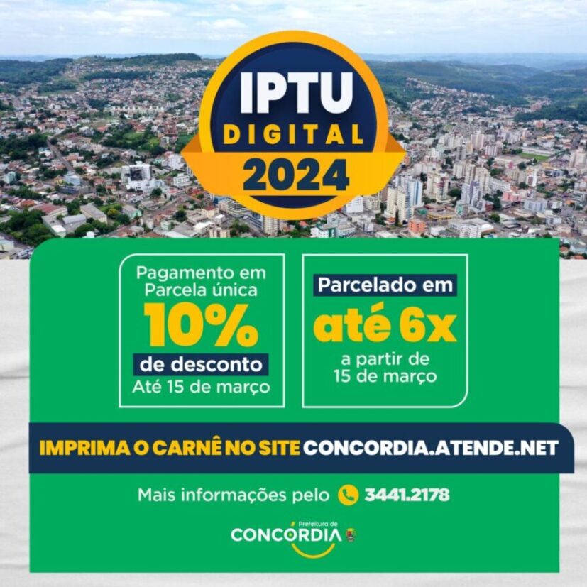 A Secretaria da Fazenda do Município já disponibilizou no site da Prefeitura de Concórdia a emissão do Imposto Predial e Territorial Urbano – IPTU 2024. Proprietários de imóveis e terrenos já podem acessar concordia.atende.net e clicarem no banner principal sobre o IPTU para emissão das guias de pagamento.