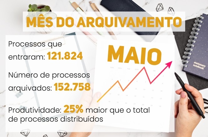 Ao longo de maio, foram arquivados 152.758 processos, superando em 14% a meta inicial e representando um número 25% maior que o total de novos processos distribuídos no mesmo período (121.824). O resultado reforça o compromisso das unidades judiciais com a melhoria dos fluxos processuais e a entrega de decisões com maior celeridade.