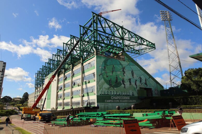 Um guindaste está trabalhando nesta semana na ala Norte da Arena Condá para a montagem da estrutura metálica da cobertura e montagem da estrutura metálica da torre de escada. Esta é uma parte das obras de ampliação e modernização do espaço desportivo que é da Prefeitura , mas que serve também para a Chapecoense mandar seus jogos.
