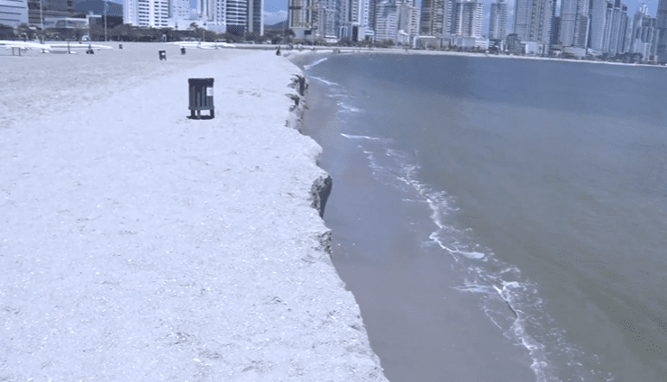O mar avançou e “tomou” de volta cerca de 70 metros do alargamento da faixa de areia da Praia Central, em Balneário Camboriú, Litoral Norte. Com uma largura inicial de 180 metros, hoje o trecho está com 110 metros.