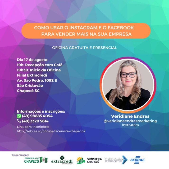 “Como usar o Instagram e o Facebook para vender mais na sua empresa” será tema de oficina gratuita e presencial com a instrutora Veridiane Endres no dia 17 de agosto (quarta-feira), a partir das 19h, em Chapecó. A iniciativa é da Administração Municipal, do Simplifica Chapecó, da Extracredi e do Sebrae/SC por meio do Programa Cidade Empreendedora. A capacitação acontecerá na Filial da Extracredi, localizada na Avenida São Pedro, nº 1092-E, no bairro São Cristóvão.