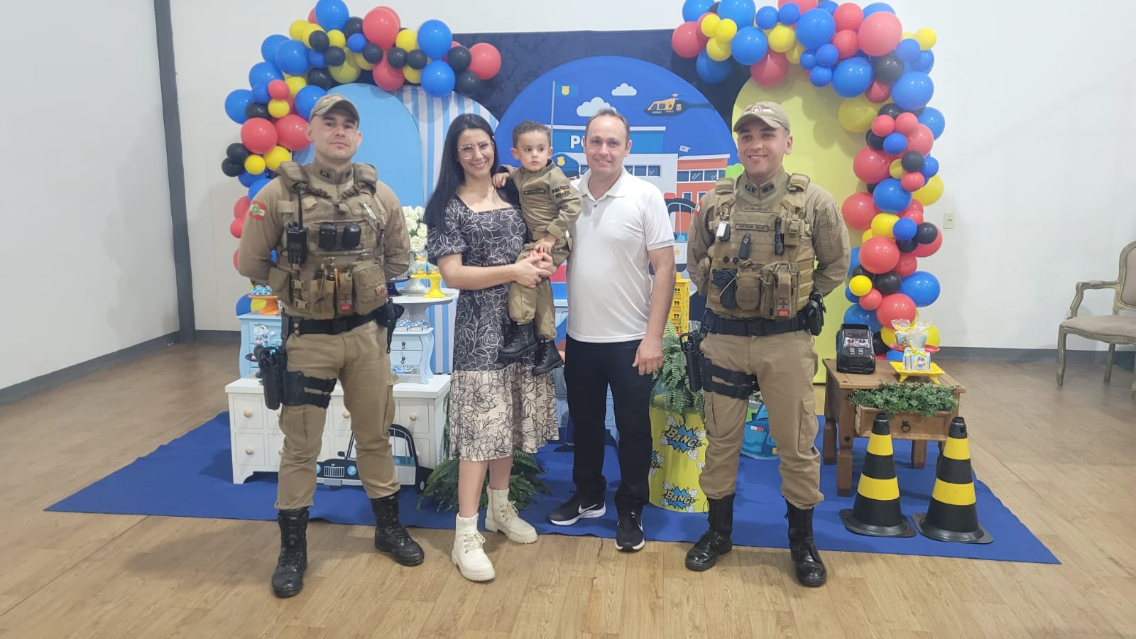 O padrinho de Bernardo é policial militar em Balneário Rincão, mas como não conseguiu comparecer na comemoração, a madrinha do garoto, Cristiani Coimbra, teve a ideia de convidar os PMs de Criciúma.