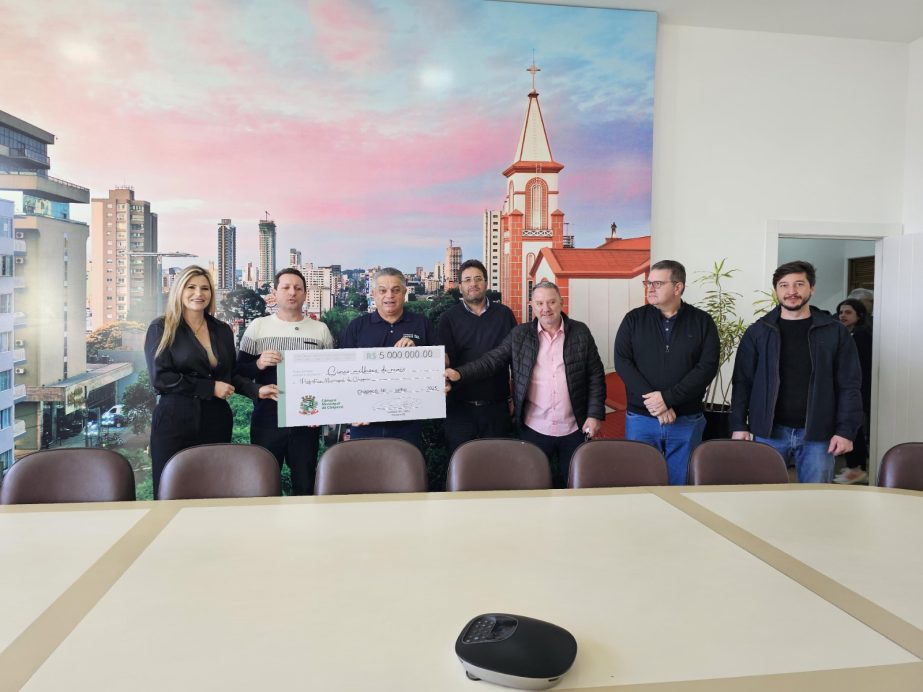 O prefeito de Chapecó, João Rodrigues, recebeu na manhã desta sexta-feira (1º), um cheque simbólico no valor de R$ 5 milhões. O ato representou a economia de recursos da Câmara Municipal de Chapecó no primeiro semestre deste ano e que agora foram devolvidos aos cofres públicos.