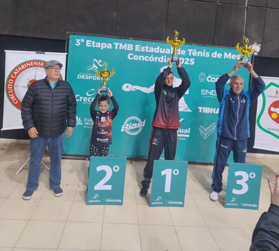 A equipe Prefeitura de Chapecó/ADCTM de tênis de mesa garantiu mais prêmios para município, no último fim de semana. Foram nove pódios e o vice-campeonato geral em Concórdia, durante a terceira etapa do Circuito Catarinense de 2025, no Centro de Eventos.