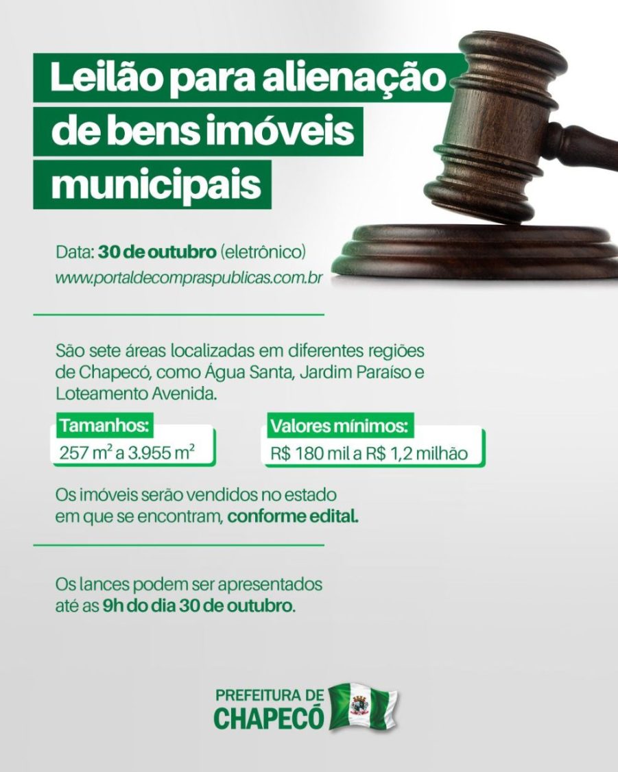 A Prefeitura de Chapecó abriu novo processo aos interessados em participar de leilão para a alienação de bens imóveis da Administração Municipal. Serão sete áreas públicas a serem leiloadas no dia 30 de outubro na forma eletrônica.
