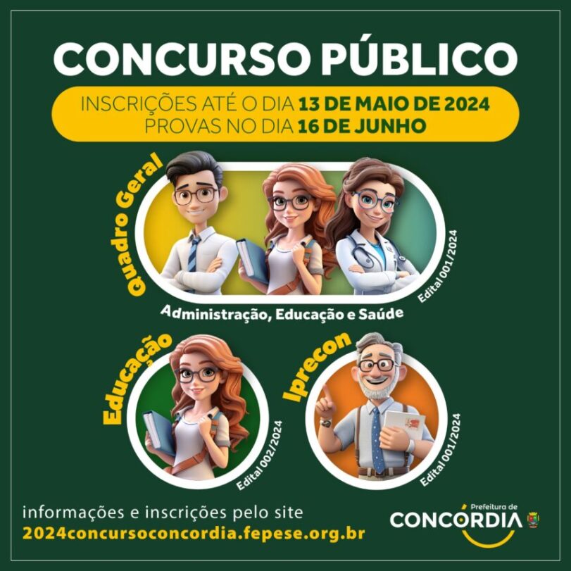 Os editais, com todas as informações sobre o Concurso Público, estão disponíveis no site da Fepese, pelo link http://2024concursoconcordia.fepese.org.br. Será disponibilizado atendimento presencial aos candidatos no Telecentro Municipal, anexo ao Terminal Rodoviário Municipal Prefeito Neudy Primo Massolini, rua Dr. Maruri, 1474, em dias úteis, das 8h às 11h30 e das 13h30 às 17h.