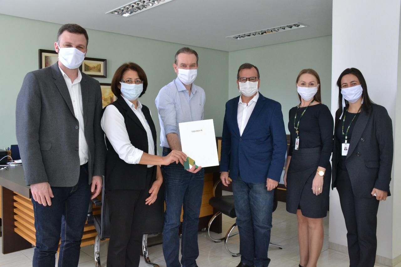 O vice-presidente da cooperativa, Dr. Celso Marques Menezes, o diretor administrativo, Daniel Ferranti, a gerente da agência Unicred Xanxerê, Suelen Faé iniciaram a entrega dos recursos.